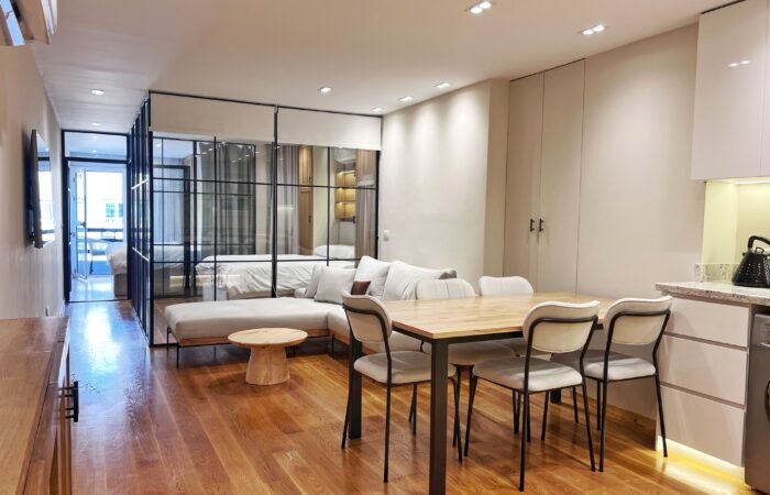 This highly modern newly renovated apartment offers a practical layout and modern furnishings. It features a spacious living room with a dining area, a fully equipped american kitchen, three bedrooms (two with king-size beds, 2 single beds), two full bathrooms (one en-suite), and a guest toilet. Split air conditioners provide efficient cooling and heating.